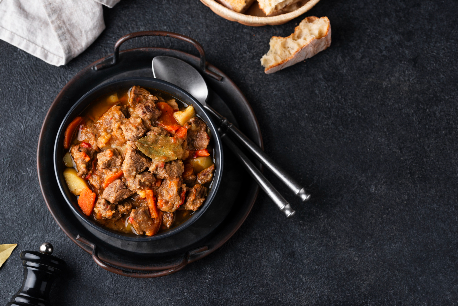 Beef cooked in pickled spices with bell peppers, onions, and tomatoes